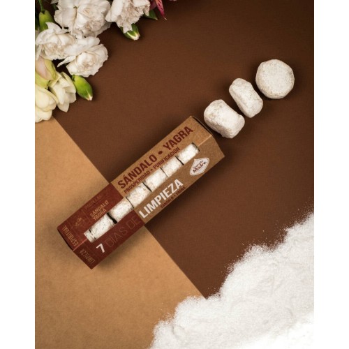 Compleet zevendaags reinigingsritueel met 7 verschillende pastilles: sandelhout, copal, roos, rozemarijn, calendula-kamille, zeven kruiden en yagra-wierook. Elke dag een andere werking voor meerdimensionale reiniging. Perfect om gedurende een week je ruimte op meerdere niveaus te zuiveren en vernieuwende energie toe te voegen.